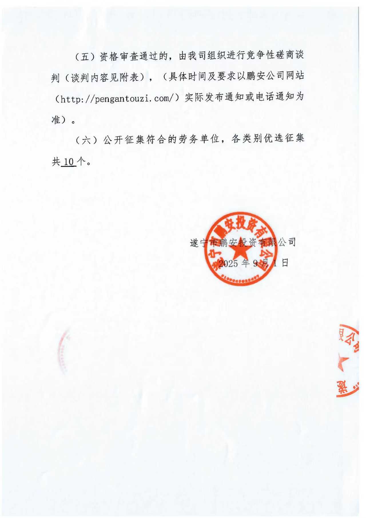 遂宁市鹏安投资有限公司关于公开征集劳务单位备选库入库的公告补遗书