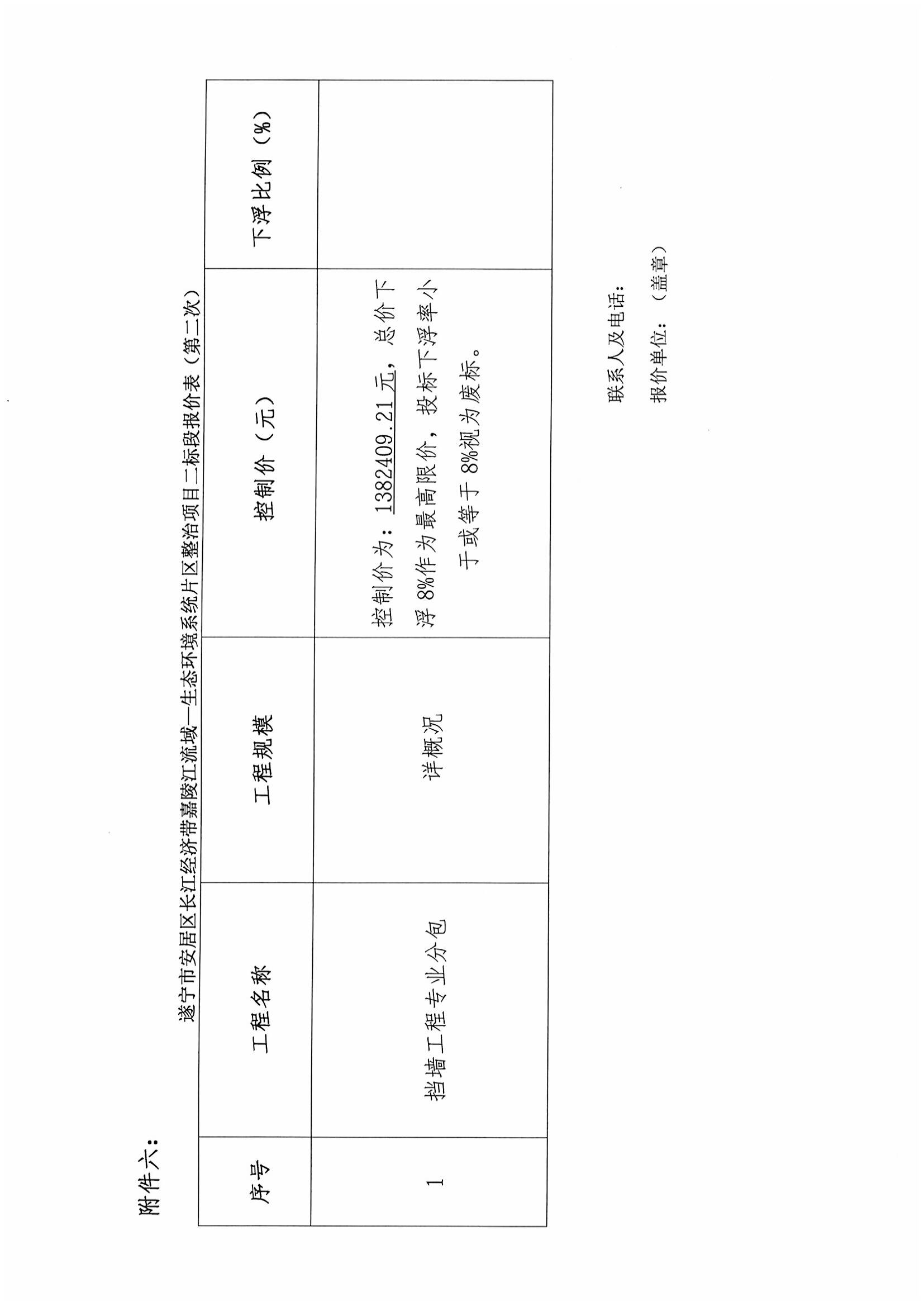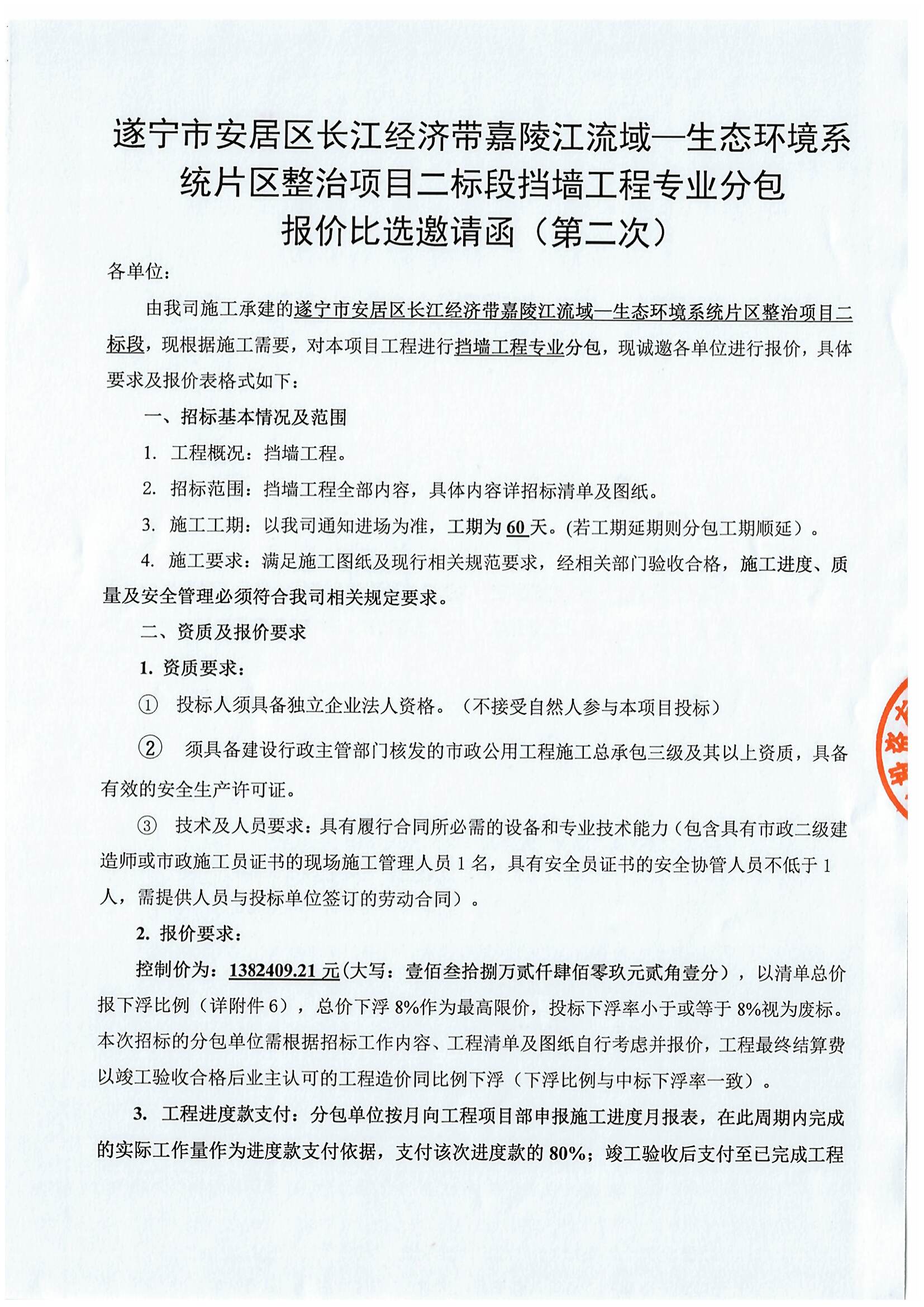 遂宁市安居区长江经济带嘉陵江流域—生态环境系统片区整治项目二标段挡墙工程专业分包 报价比选邀请函(第二次)